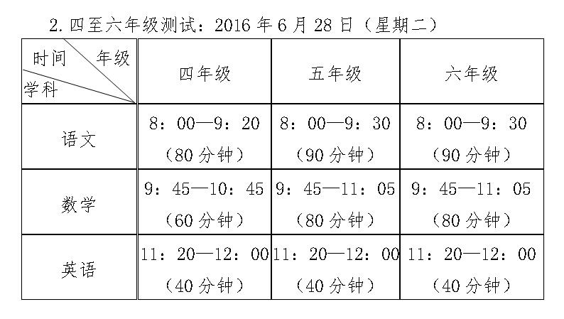 一、二、三、四、五年级语文、数学,三、四、五年级英语,由学校组织考试、阅卷;六年级语文、数学、英语由片组织考试、阅卷。所有试卷由区教研室统一印制。