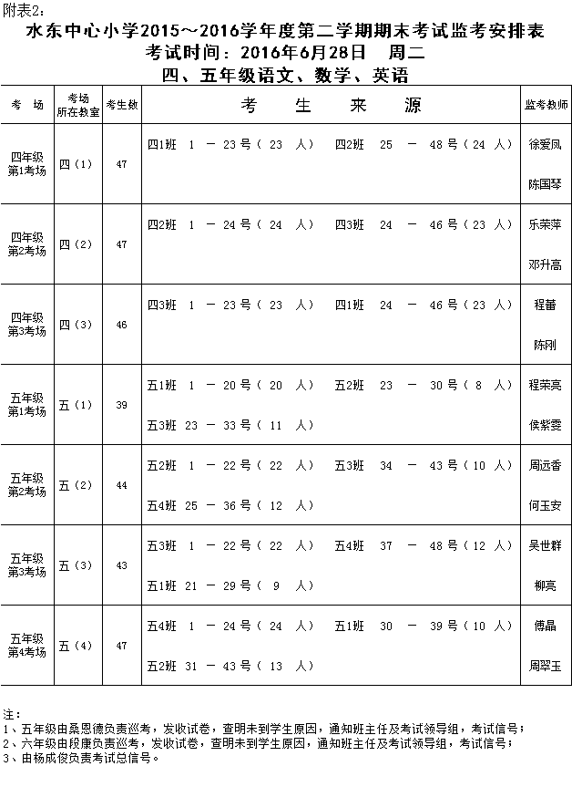 2、本校四、五年级语文、数学、英语考试监考安排见附表2(6月28日)。