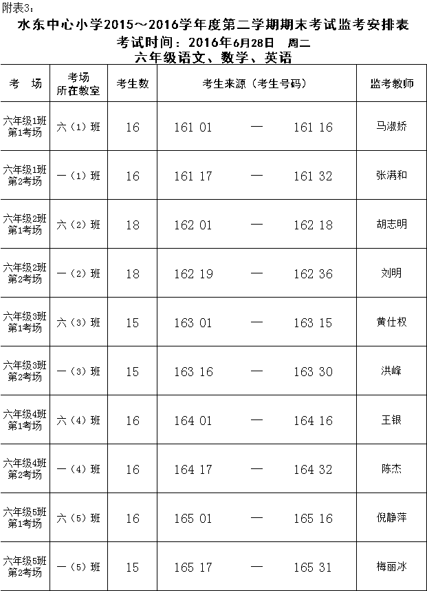 3、本校六年级语文、数学、英语考试监考安排见附表3(6月28日)。