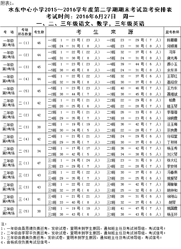 1、本校一、二、三年级语文、数学,三年级英语考试监考安排见附表1(6月27日)。