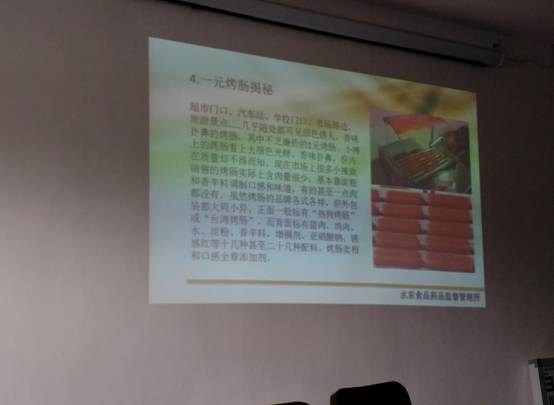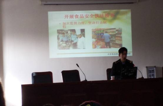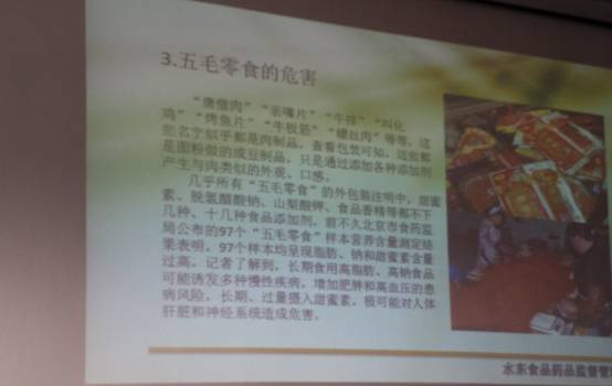 培训中,举实例讲了发生的食品安全事件,为师生介绍了当前食品安全现状。让师生了解什么是食品安全、世界卫生组织公布的全球十大垃圾食品、知晓食用垃圾食品的危害、如何辨别垃圾食品及食物中毒的预防等食品安全知识。建议学生不要吃一元烤肠、五毛零食等,不到无证、无照摊点上购买食品。在互动环节中,学生能主动说出这次培训的所感所想。