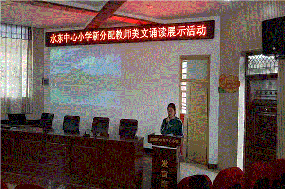 这里是水东中心小学报告厅,新分配教师向芬老师正在朗诵余光中的《写给未来的你》,娓娓动听的声音充满了老师对未来孩子健康成长的期待,真诚的话语表达着自己对教育理念的理解。