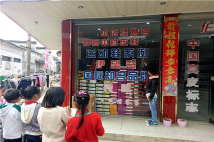 孩子们先从水东老街入口的牌匾开始找起,一边慢慢地往前走,一边睁大眼睛、仔仔细细地寻找错别字与不规范的汉字。突然,陈芯蕊惊喜地叫了起来:“你们看,那里有个错别字!”同学们顺着她手指的方向看去,发现“运动鞋系列”中的“列”字多了一个单人旁。于是,大家赶紧在自己携带的“日积月累”本上将错字记录下来,然后把正确的汉字写在旁边。