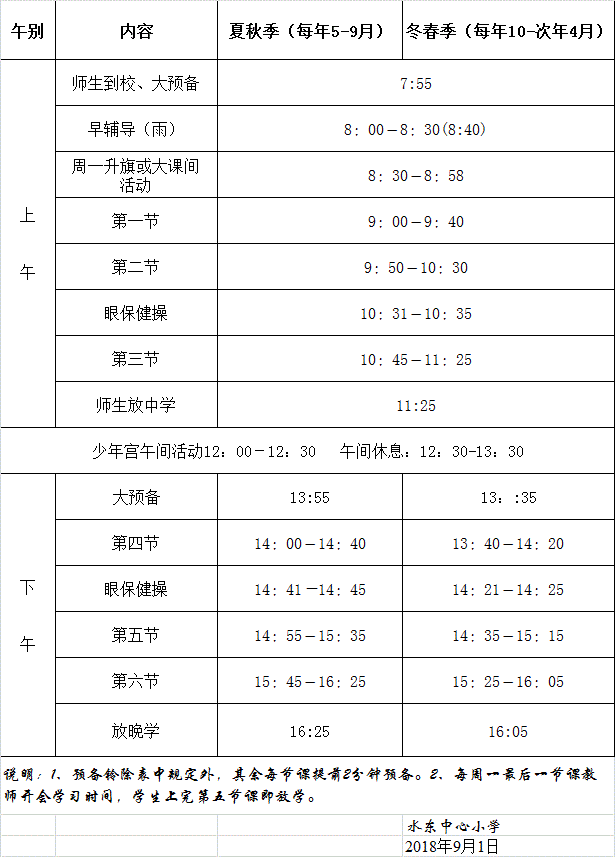 水东中心小学四季作息时间表