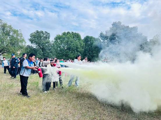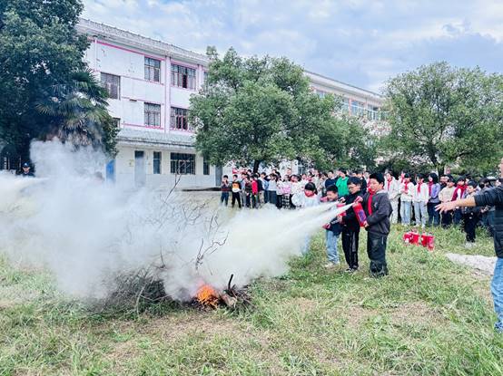 德育处主任段康现场演示灭火器“提、拔、握、压”四步操作法,并指导学生使用。随后,学生分组体验灭火器扑灭火源,在互动中掌握实用技能。