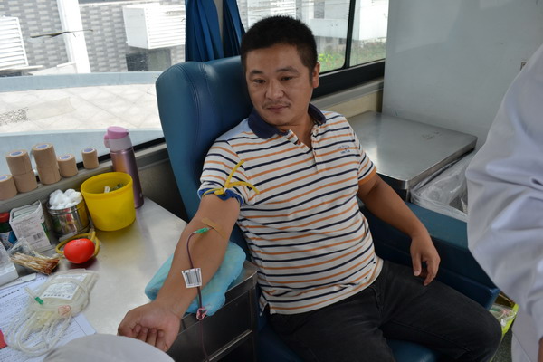 徐抗震,水东中心小学校长,义务献血整10年,每次学校组织的义务献血活动都没有缺席过。袁美,水东中心小学教师,这次献血是她第一次献血,看的出她有些紧张,但是眼神中透着坚定。